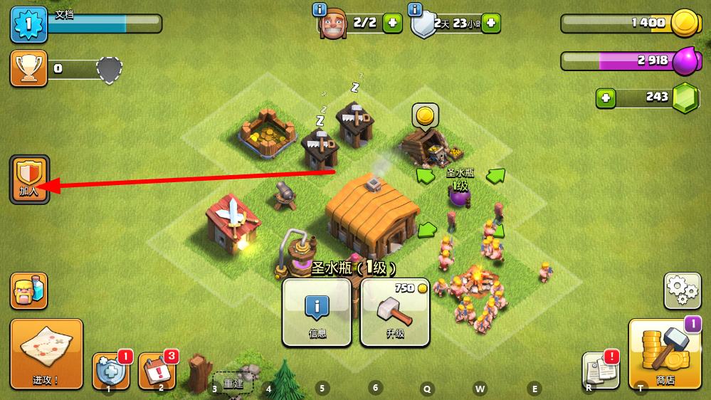 1、在部落冲突游戏界面,点击左侧加入图标,进入加入部落页面。