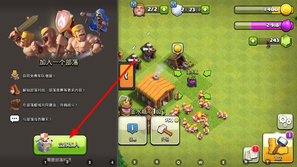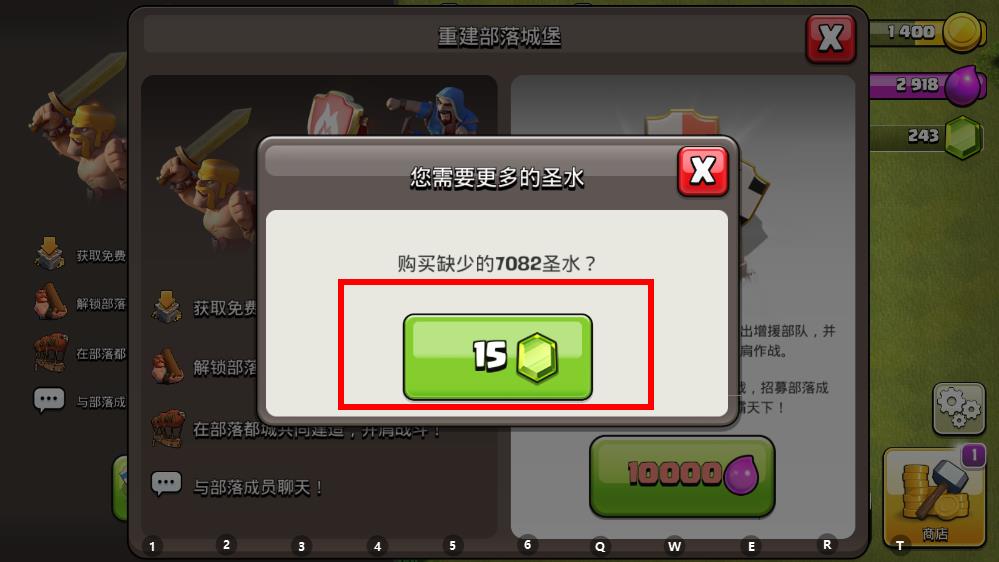 4、若圣水不足,按提示选择花费15宝石购买缺少的圣水,完成后即可尝试加入部落。