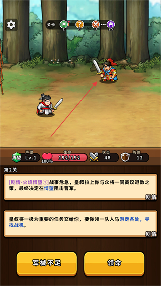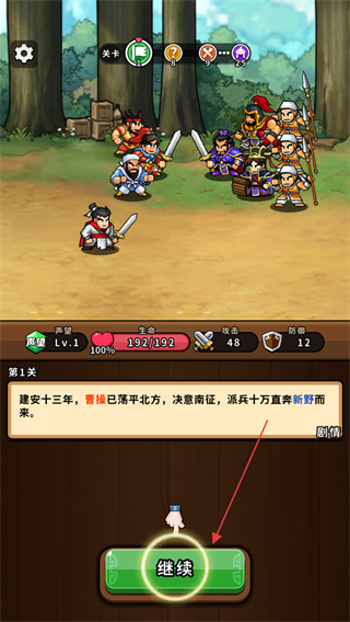 1、查看第1关剧情,点击继续推进流程,进入关卡准备接受任务。