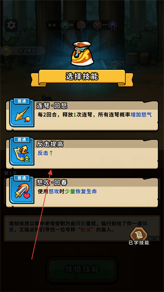 4、在选择技能界面挑选技能如反击提高,装配后增强战斗能力。