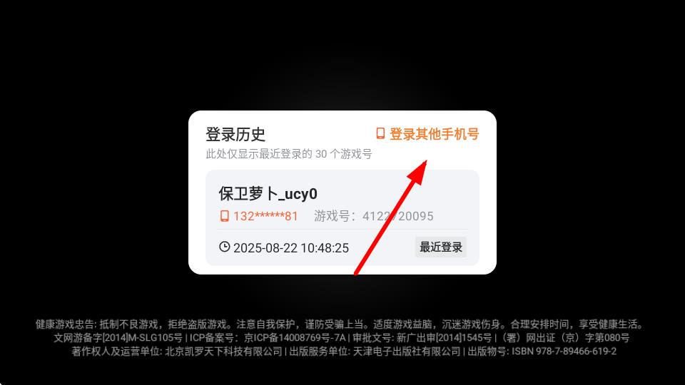1、打开保卫萝卜游戏,在出现的界面中看到登录历史弹窗,若有你想登录的账号可直接点击最近登录,若没有则点击登录其他手机号。