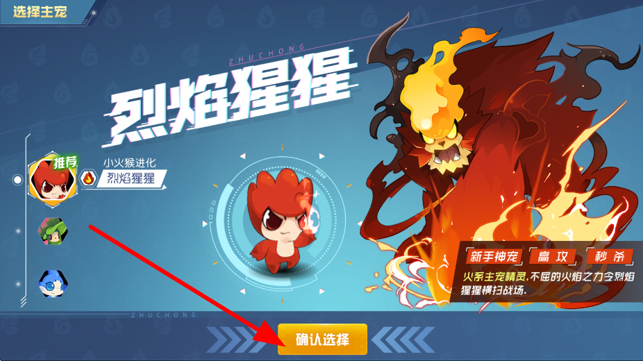 3、然后来到主宠选择,像烈焰猩猩等精灵可供选择,挑选好主宠精灵后点击确认选择,选定的主宠将陪伴玩家开启精灵冒险。