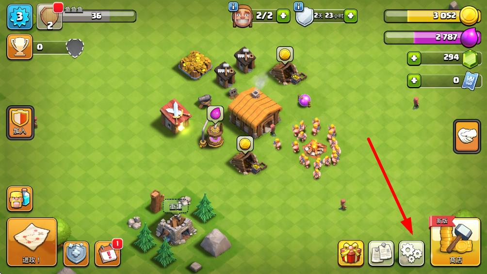 1、进入部落冲突游戏主界面,点击屏幕右下角的齿轮图标,打开设置页面。