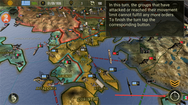 3、依据提示,本回合中攻击过、或达移动上限的部队无法再执行命令,完成所有操作后,点击时钟按钮结束当前回合,进入敌方行动阶段。