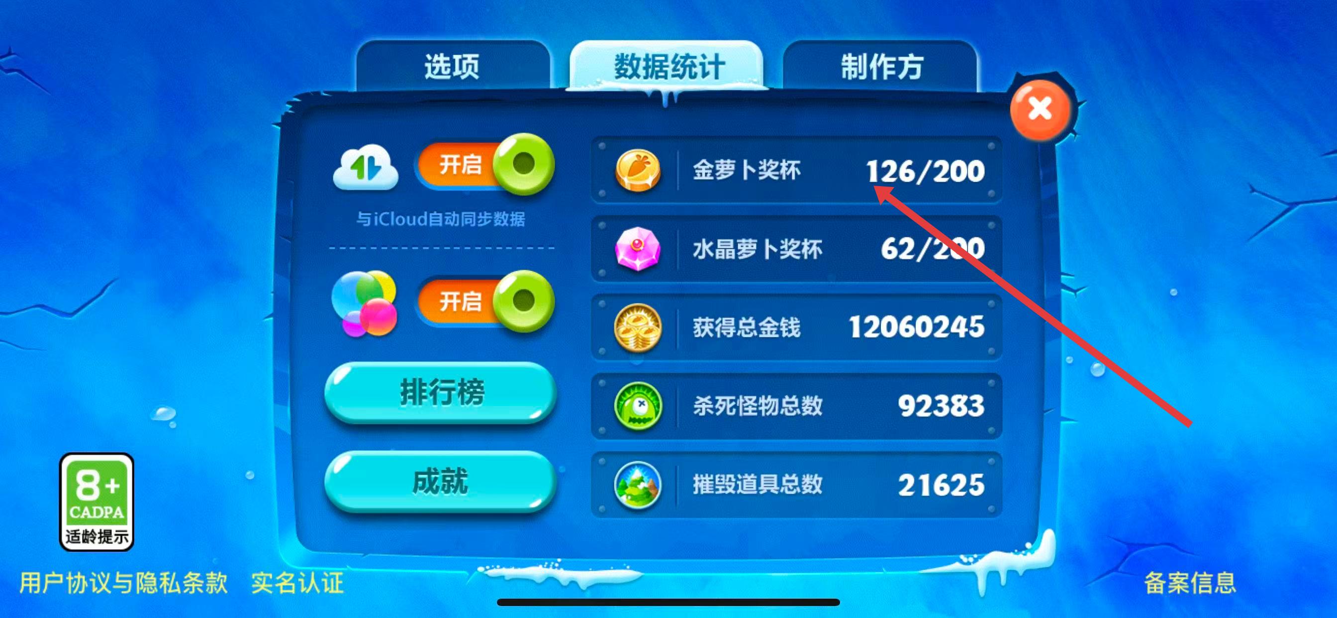 4、在数据统计界面中,找到金萝卜奖杯选项,其右侧显示的数字,前面的数值代表已获得的金萝卜数量,斜杠后面的数值代表游戏中总的金萝卜数量。