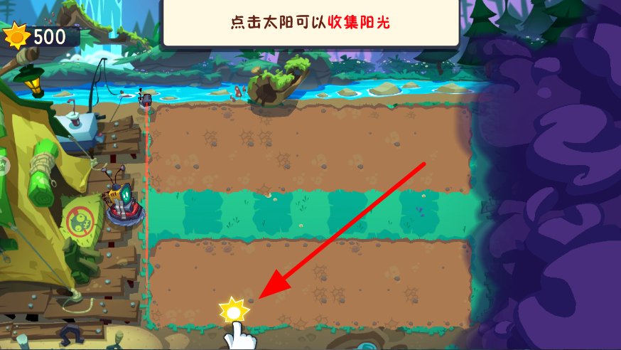 1、进入游戏后,点击场景中的太阳,收集阳光,阳光是种植植物的重要资源,通过持续收集,为后续种植植物做好资源储备。