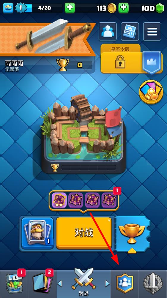 1、打开皇室战争游戏,进入主界面后,点击底部导航栏中的部落图标,进入部落相关界面。