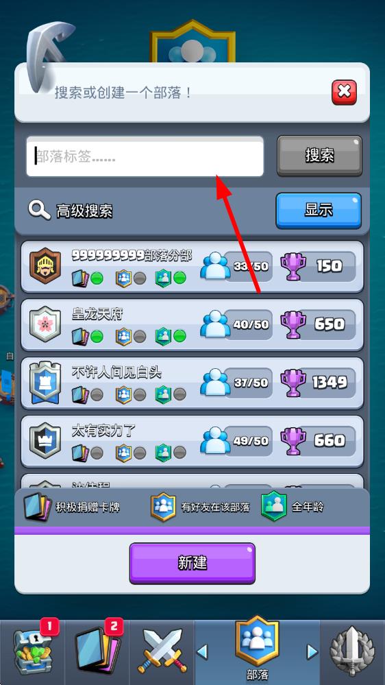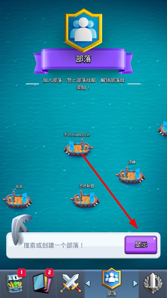 2、在部落界面中,找到下方搜索或创建一个部落的输入框区域,点击右侧的显示按钮,展开搜索界面。