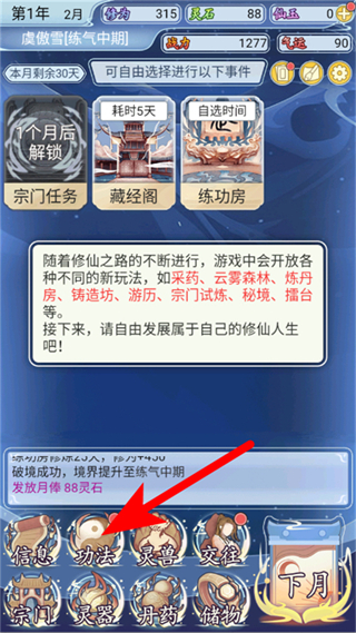 2、在修仙主界面,点击功法选项,进入功法修炼的页面。