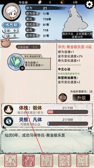 1、获得华氏-聚金极乐笈心法,其提供修为自增等属性,助力修仙。