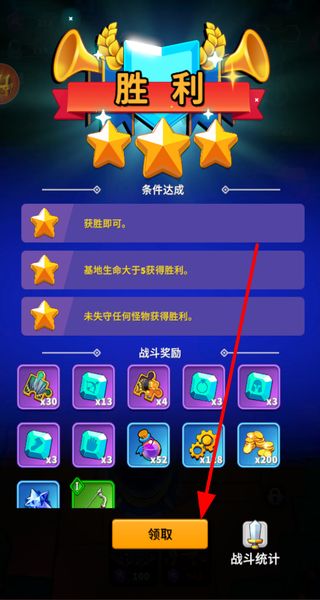 4、领取战斗奖励,战斗胜利后领取奖励,获取资源和道具,用于角色和防御塔养成,丰富游戏体验。
