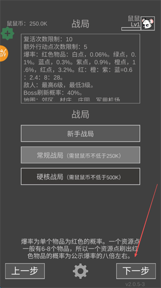 老鼠大冒险(免内购)是一款主打真实夺金体验的文字生存策略作品,免内购福利解锁全功能权限,无需付费即可畅享完整玩法,高度还原配装、挣钱、商人交易等多元系统与机制,以回合制形式展开冒险,搜索、战斗等动作均消耗行动力,战斗中融入架枪冲锋、瞄准部位等丰富策略选择,敌人拥有与玩家同等的行动能力,单机模式也能体验堪比真人对战的博弈乐趣。