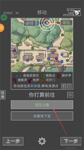 4、消耗行动点选择前往郊区小路,移动至下一个资源点继续探索。
