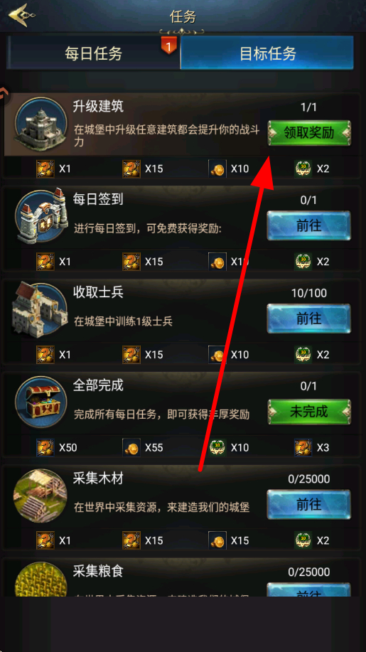4、最后完成每日任务、目标任务等,在任务界面点击领取奖励,获取金币、资源等奖励,用于后续的建筑建造、士兵训练等。