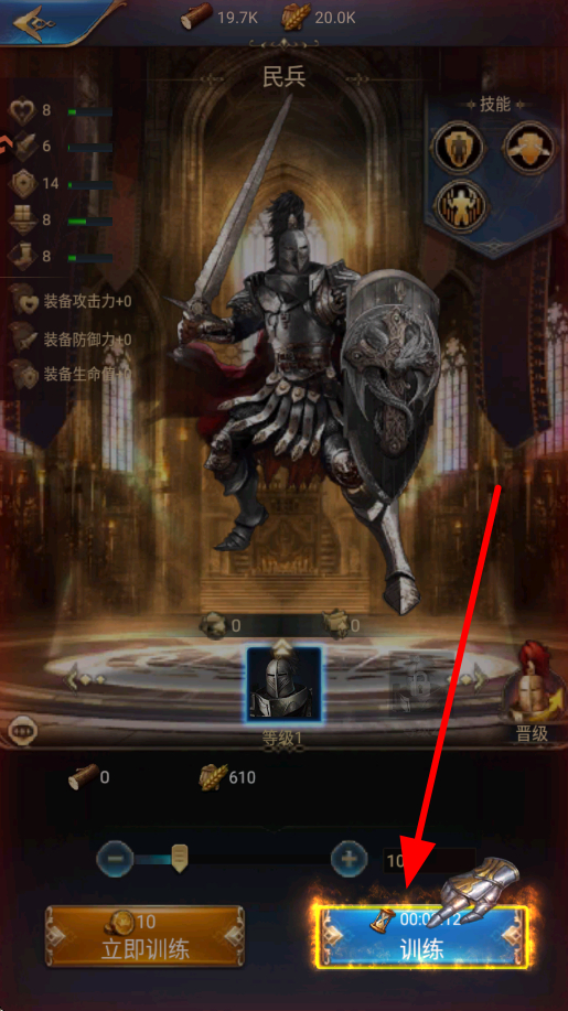2、接着进入士兵训练界面,选择民兵等士兵类型,准备好所需资源后,点击训练,培育部队力量,增强领地的军事能力。