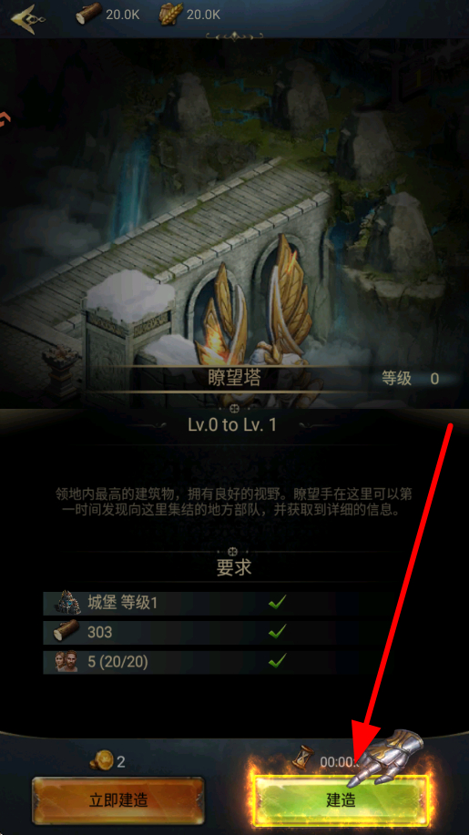 1、首先在游戏中,查看建筑建造要求,如瞭望塔,满足城堡等级、资源等条件后,点击建造,提升领地的建筑设施水平。
