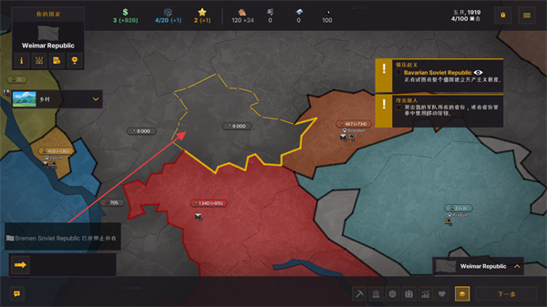 2、观察红色占领区域,查看敌方BavarianSovietRepublic信息,点击下一步。