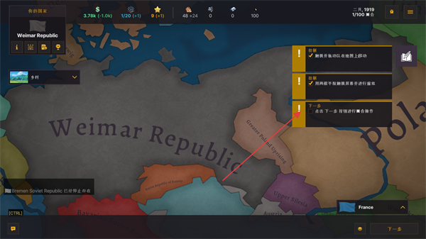 1、查看任务提示,确认当前操控WeimarRepublic,点击下一步推进流程。