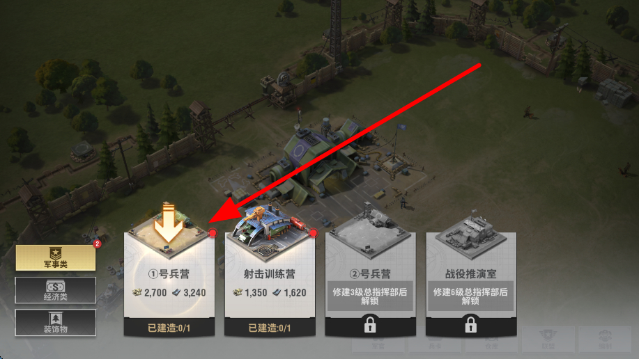 3、建筑选择界面,挑选如1号兵营这类军事建筑,满足建造所需的资源等条件后,点击建造,建筑会被放置到指定的基地位置,为后续发展提供助力。