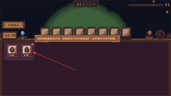2、在配置界面选择采集器和地炮,采集器用于收集晶矿,地炮用于防御。