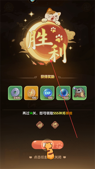 4、战斗胜利,领取金币、经验等奖励,点击任意处关闭胜利界面,继续游戏。