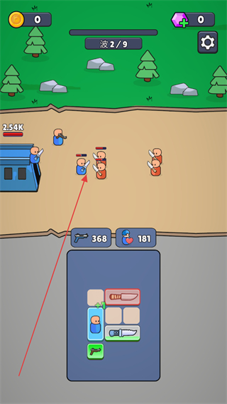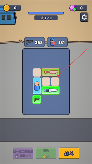 1、在波2/9界面点击召唤,获取新的武器或部队,补充背包配置。