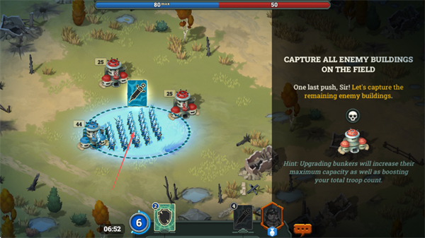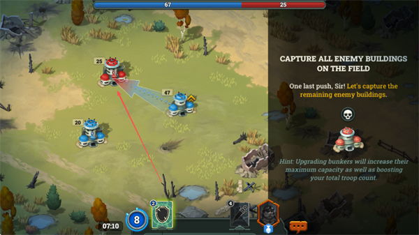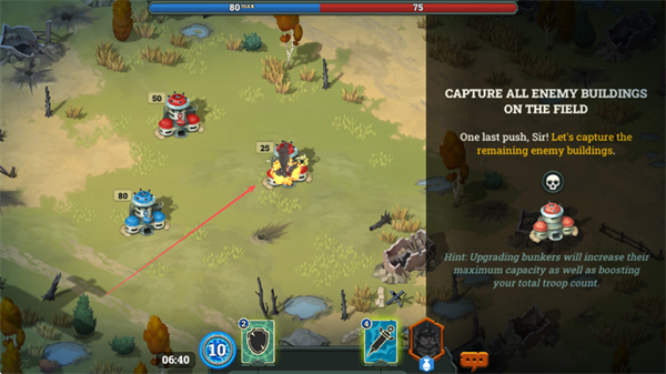 2、目标是占领战场上所有敌方建筑,升级地堡可提升兵力上限和总部队数,助力战局扭转。