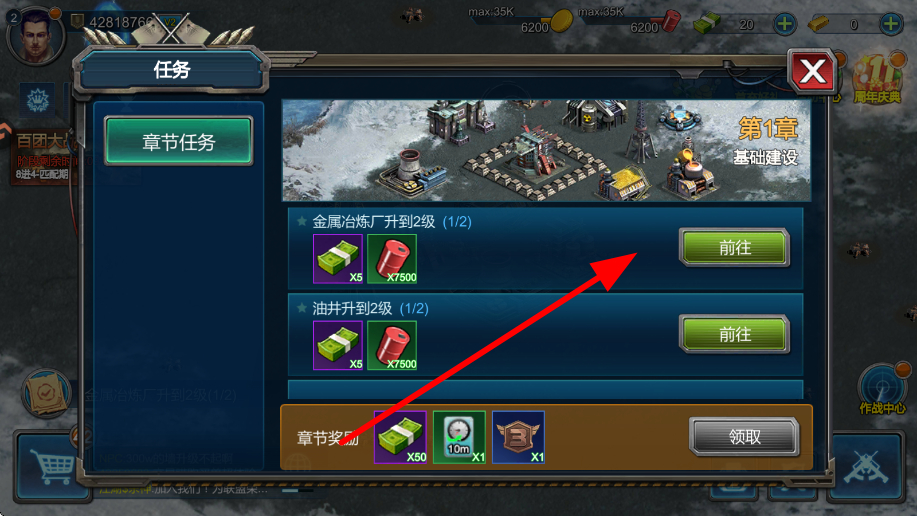 3、任务界面,会有章节任务,比如将金属冶炼厂、油井升到指定等级,点击前往按钮,可快速到达对应建筑处进行升级操作,完成任务能获得资源、道具等奖励。