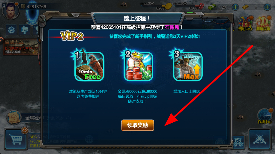 2、完成新手指引后,会获得VIP体验等奖励,点击领取奖励按钮,能获取加速道具、资源以及人口上限提升等福利,这些福利能助力基地更快发展。