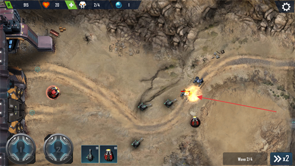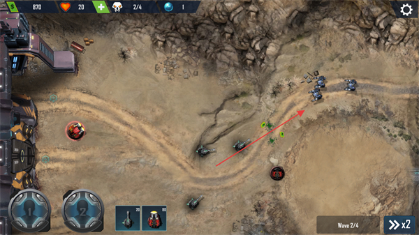 1、点击下方带标识的防御塔,部署到敌方路径旁的空位,利用其攻击范围覆盖路径,准备拦截Wave2/4的敌方单位。