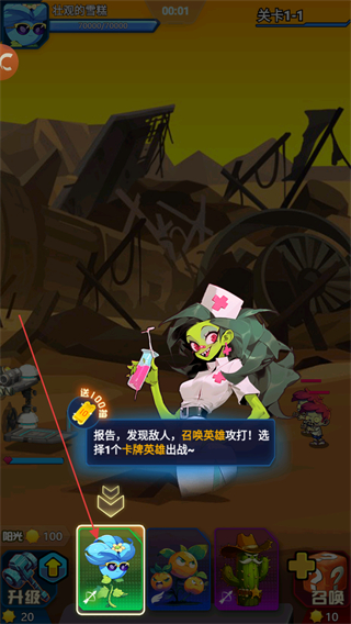 1、根据提示选择1个卡牌英雄出战,点击对应英雄卡片,将其部署至战场,准备迎击敌人。