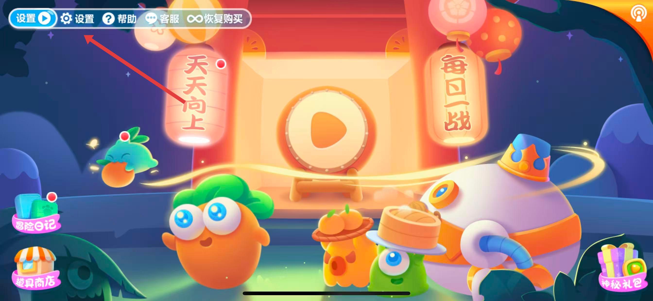 1、进入保卫萝卜2游戏主界面,点击如图中箭头所指的播放按钮,先进入到游戏关卡选择等相关界面。