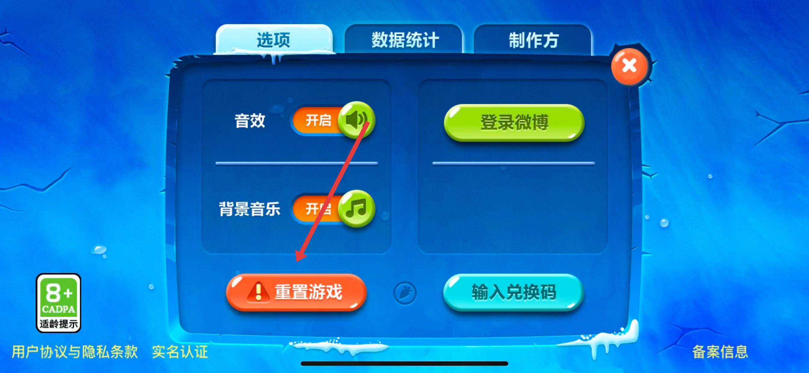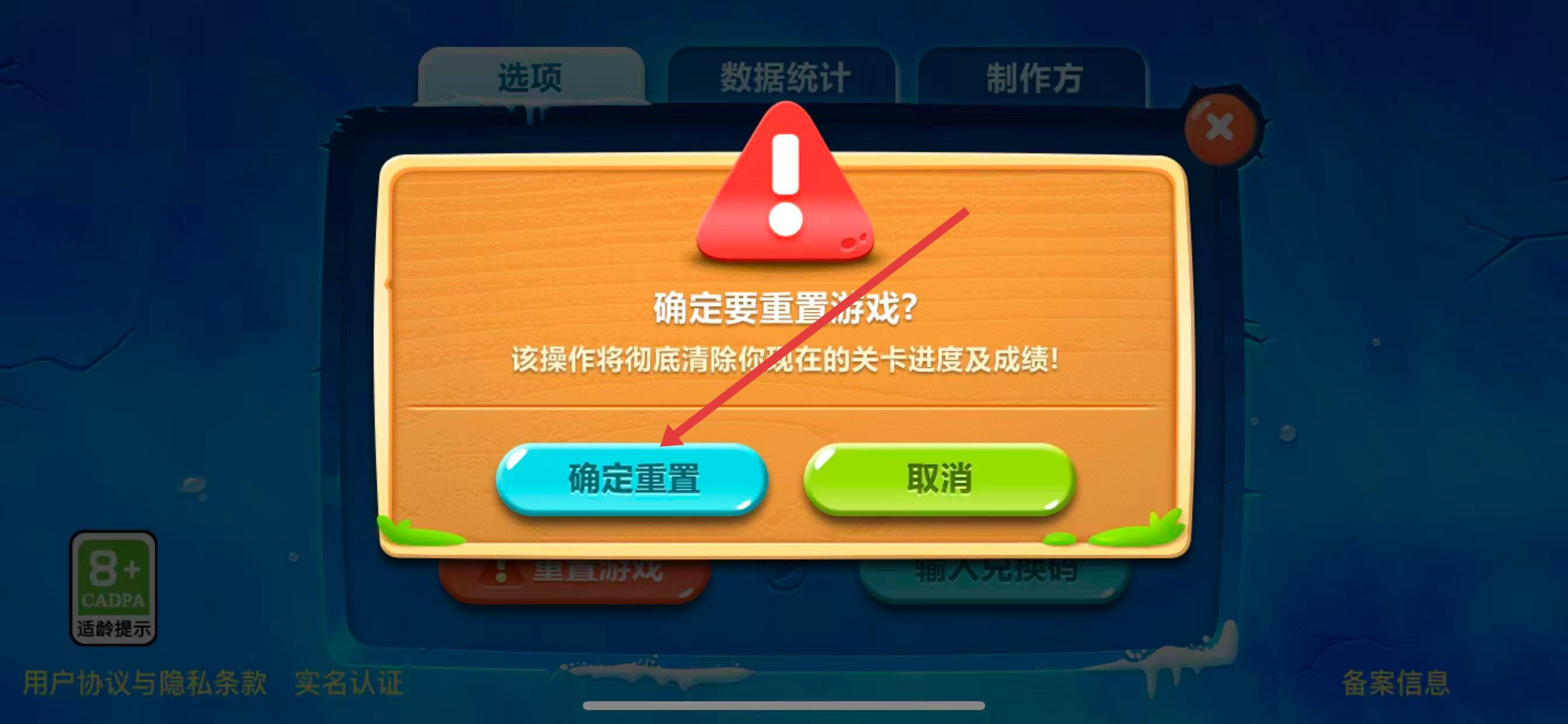 3、在设置菜单里,找到并点击重置游戏按钮,此时会弹出确认提示。