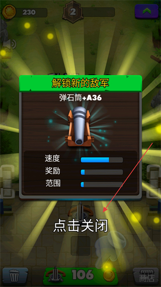 4、解锁新敌军如弹石筒+A36后点击关闭提示,继续应对新敌人进攻。