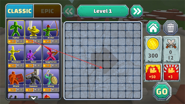 1、在Level1界面选择兵种如Fighter,放置到棋盘上组建军队。