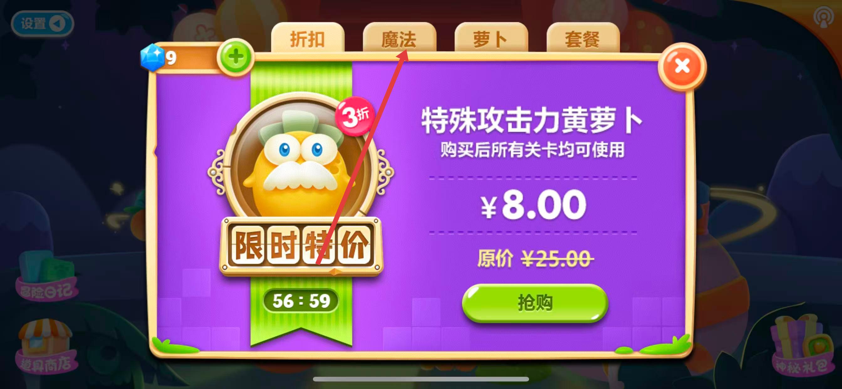 紧急情况下,可为受伤的萝卜恢复1点生命值!需要50宝石兑换1个。此魔法最好在萝卜九点血的时候使用,九点以下不要白费力气了,过关后重打吧。