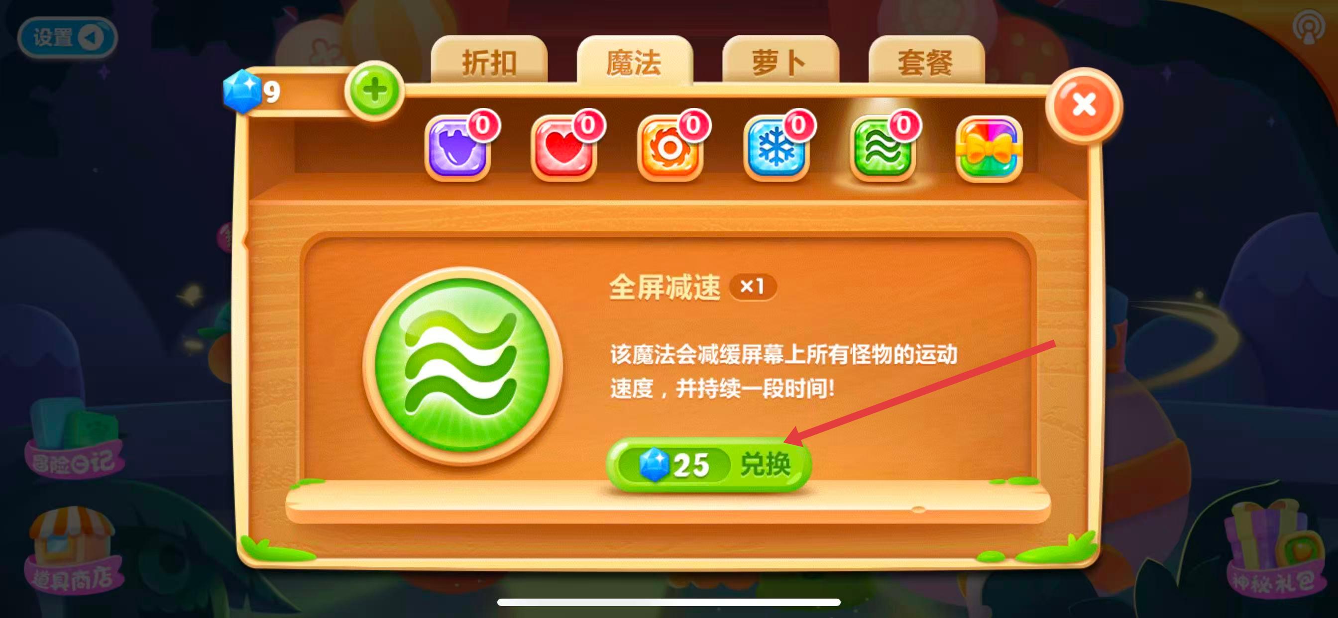 3、在魔法界面中,选择想要购买的道具,如全屏减速道具,点击道具下方的兑换按钮,消耗对应的晶体数量即可完成购买。
