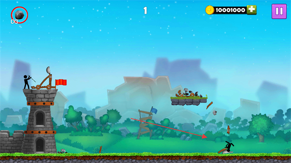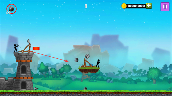 1、调整投石车角度,发射石弹攻击敌方火柴人及投石车,消灭敌人获取分数。