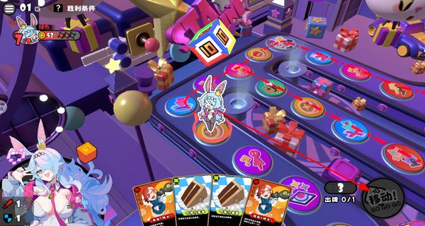 2、在棋盘场景中,先选择要出的牌,再点击移动按钮,让角色在棋盘上行动,行动过程中会经过不同的区域。
