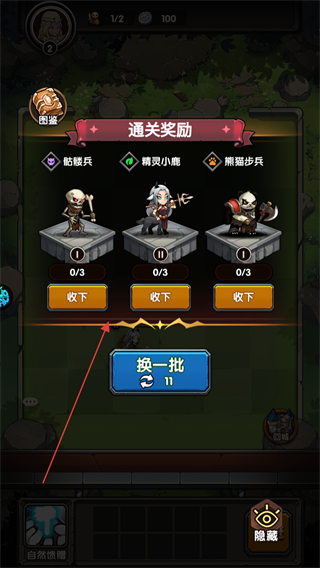 4、通关后,可选择收下骷髅兵、精灵小娜、熊猫步兵等奖励,增强己方战力。