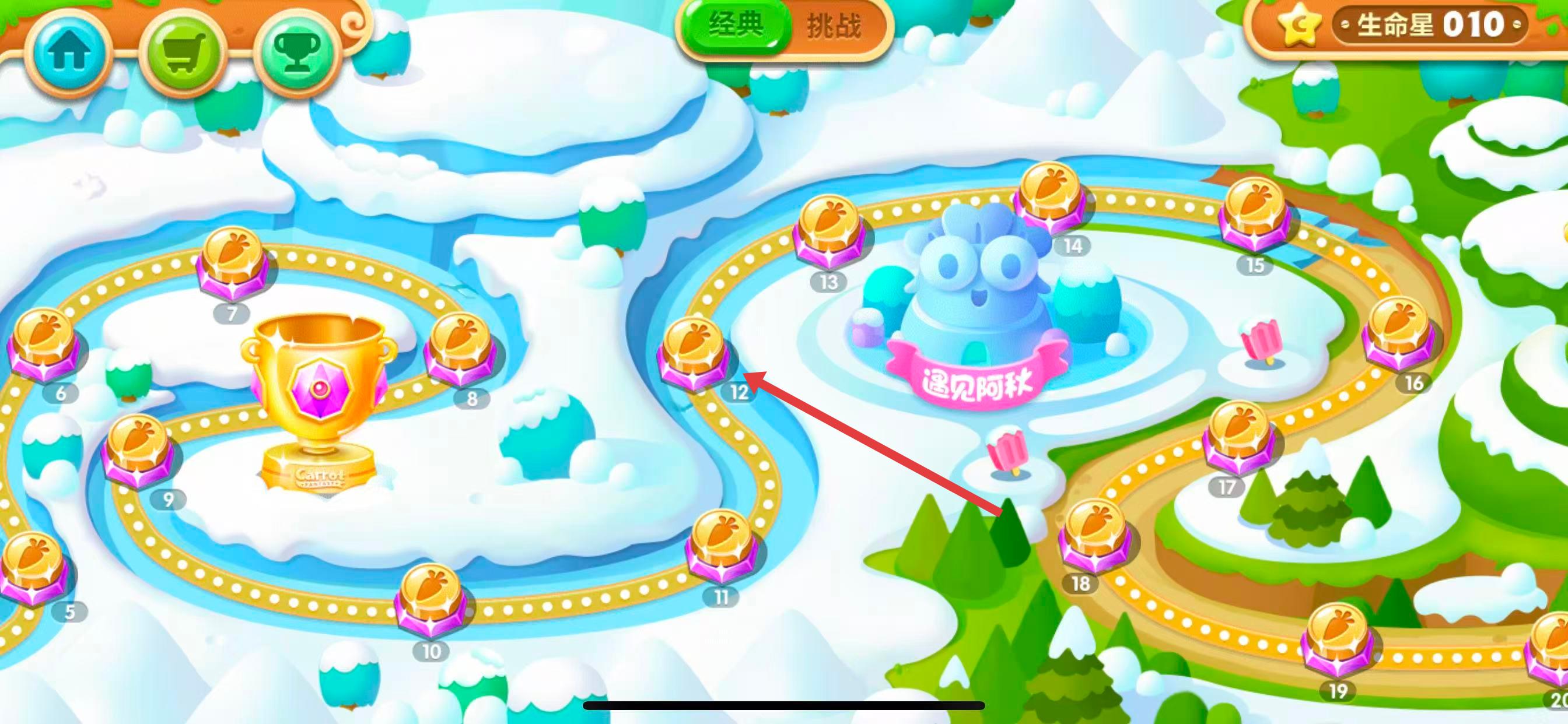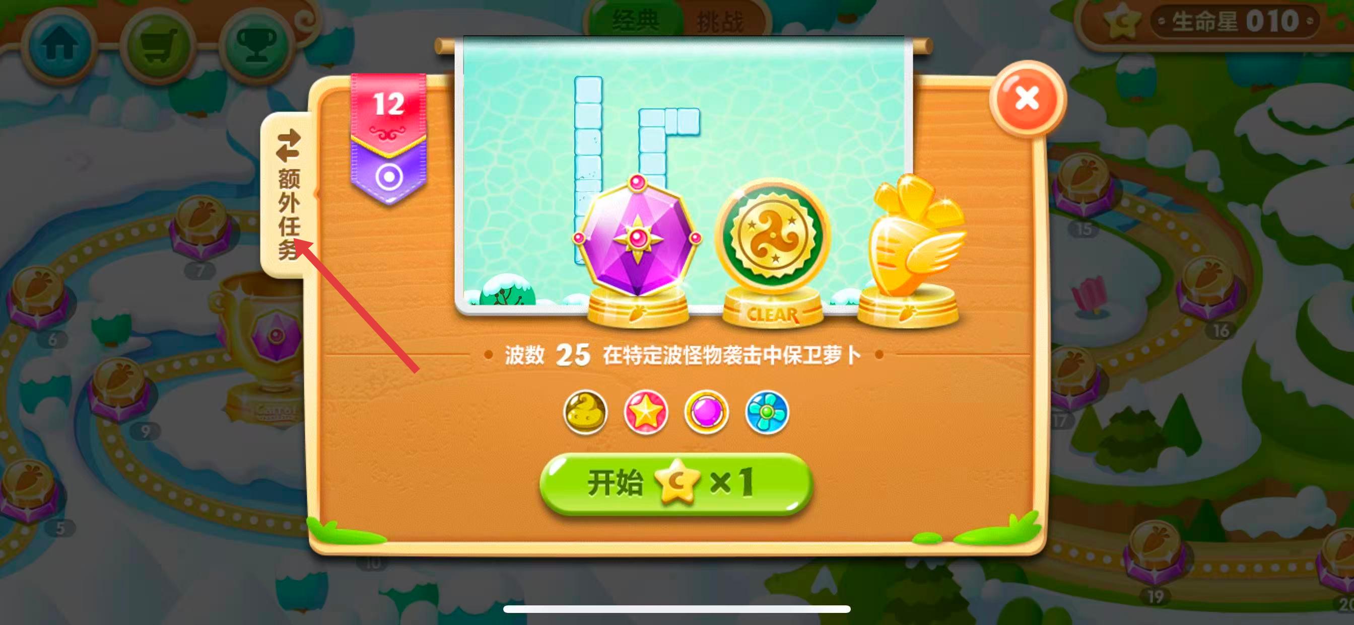 2、在关卡选择界面,点击想要查看额外任务的具体关卡,如第12关图标,进入关卡详情页。