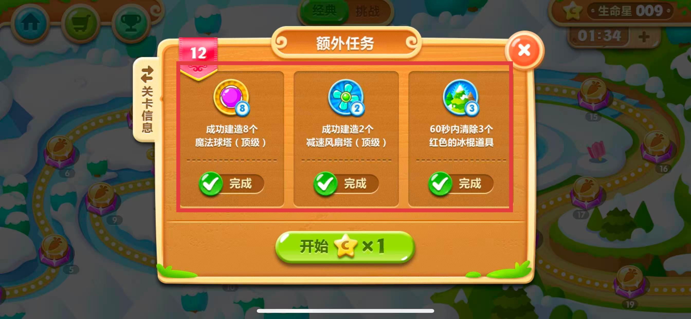 4、在弹出的额外任务界面中,即可查看该关卡的额外任务要求,如建造指定数量的特定炮塔、限时清除道具等内容。