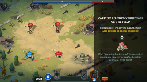 2、占领所有敌方建筑,升级地堡可增加兵力上限和总部队数,扭转战局。