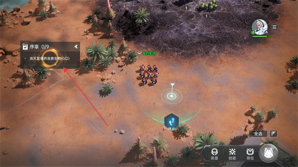 1、查看序章任务消灭2个虫族生物,点击移动指令操控军团向目标区域前进。