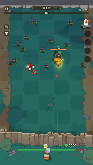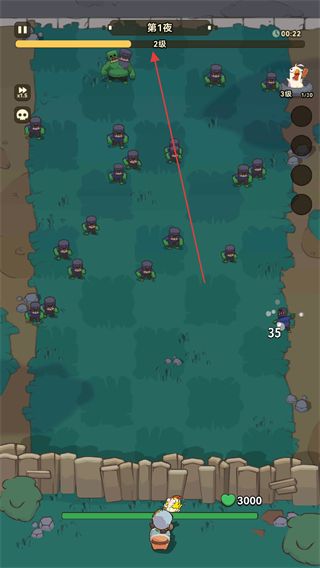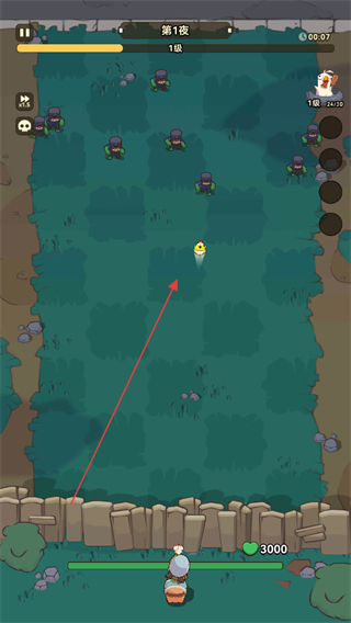 1、在第1夜的草地上,操控角色移动,躲避僵尸,同时积累经验升级。