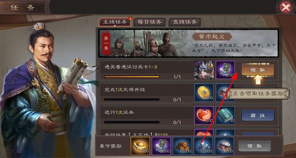 2、进入任务界面,完成主线任务后点击领取按钮,获取对应的武将道具等奖励,积累资源助力后续发展。