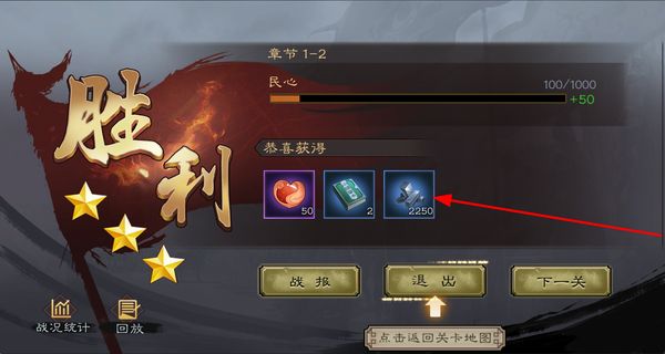 4、通关关卡后会显示胜利界面,可获取资源类奖励,点击退出返回关卡地图,准备挑战下一个关卡内容。