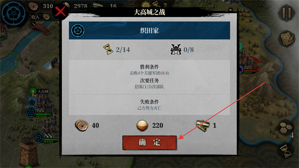 1、查看大高城之战的胜利条件,点击确定进入关卡,准备部署兵力完成任务。