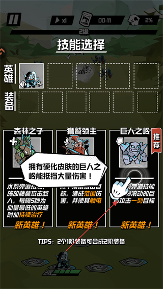 2、角色升级后,出现技能选择界面,从如森林之子狮鹫领主,巨人之峰等英雄技能中选择,增强角色能力。