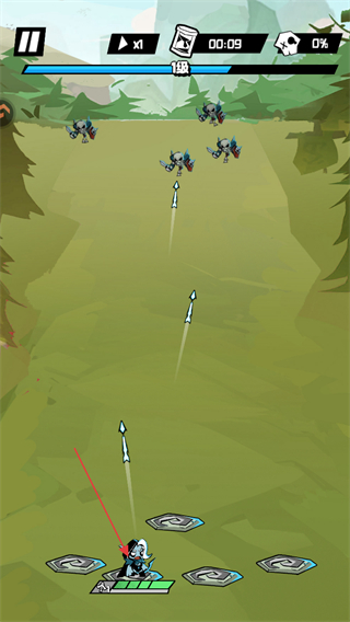 1、进入游戏,操控角色自动发射箭矢攻击前方敌人,留意屏幕上方的倒计时,如00:09。